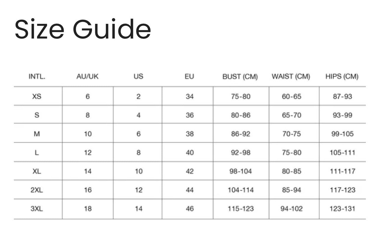 Dakota is wearing a Size S. She usually wears a size AU6, is 172.5cm (5’8”) tall, with an 79cm bust (31”), 68cm (27”) waist & 88cm (35”) hips.