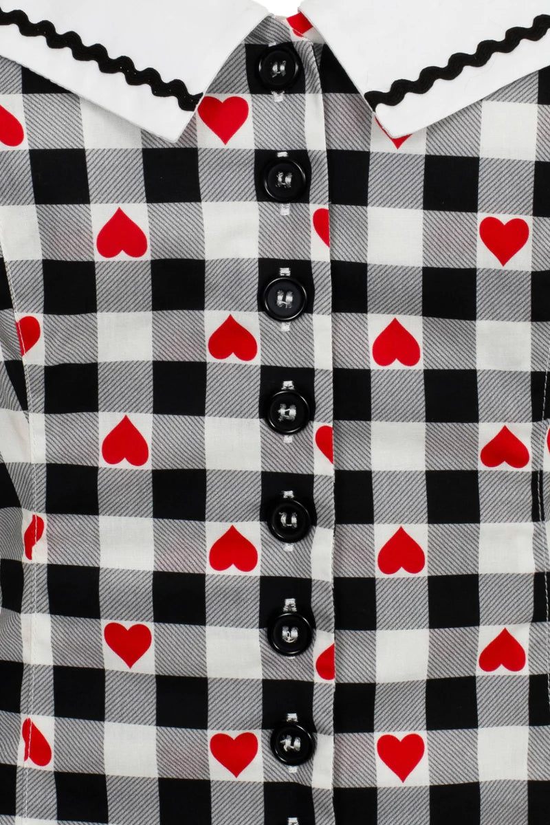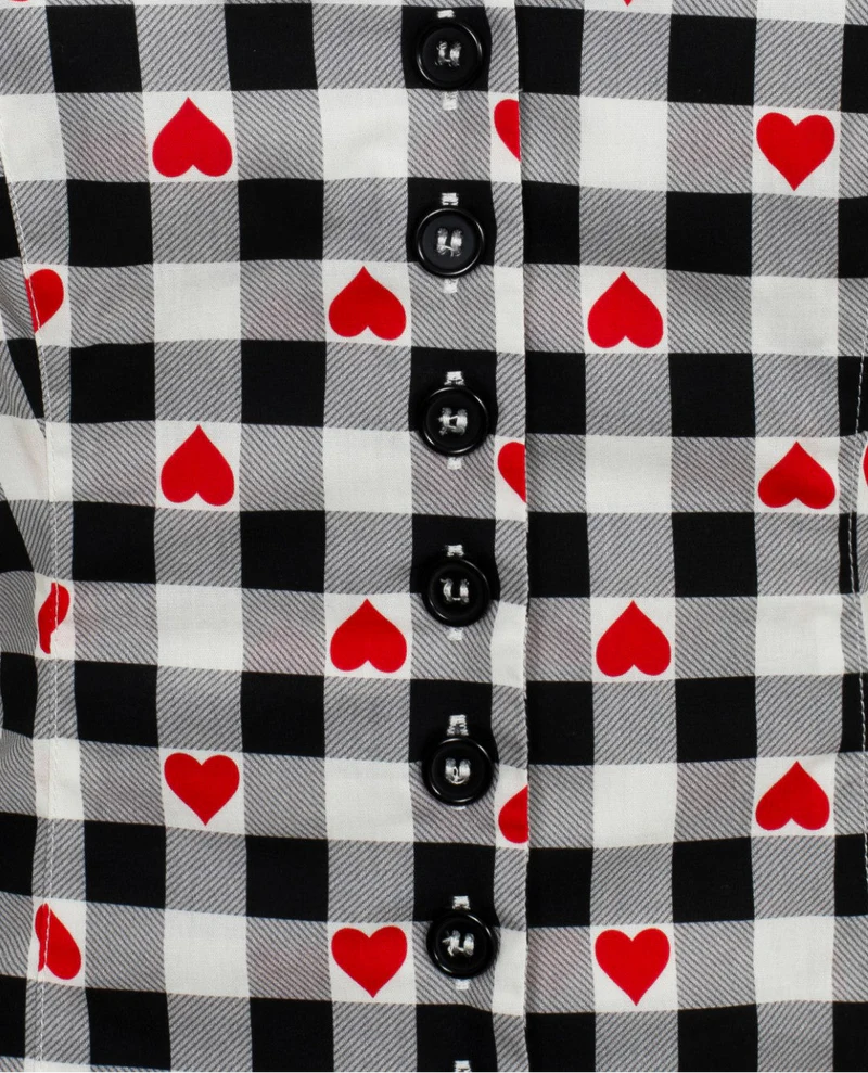 This retro style, gingham heart printed cotton top is the sweet style for you. A sweetheart neckline gives this top a flattering cut, with a black-trimmed white collar for an added vintage feel. Featuring black button-up fastening at the front, with adjustable spaghetti straps for comfort. Princess seams give this top a figure hugging shape, while the shirred panel at the back provides extra comfort.